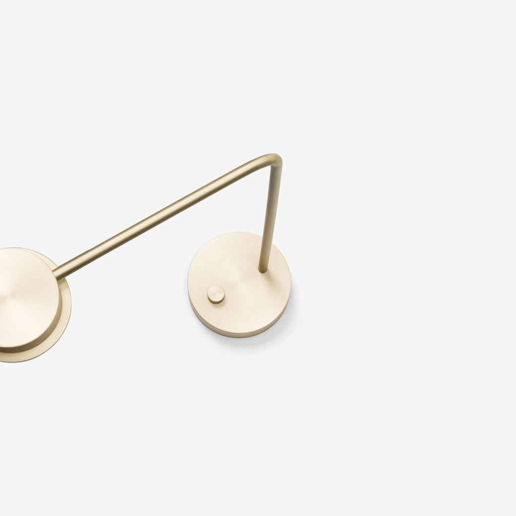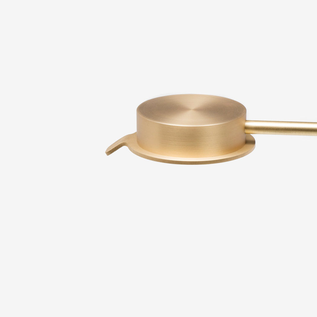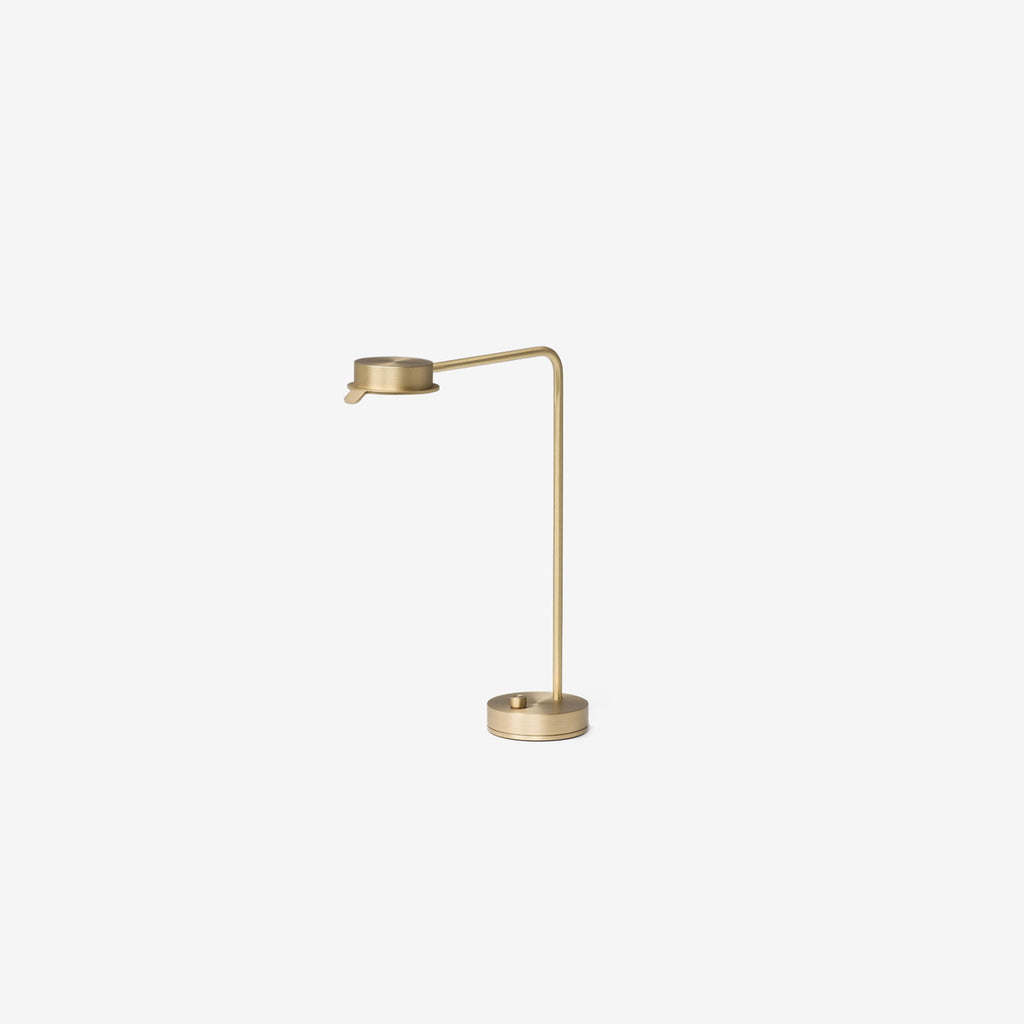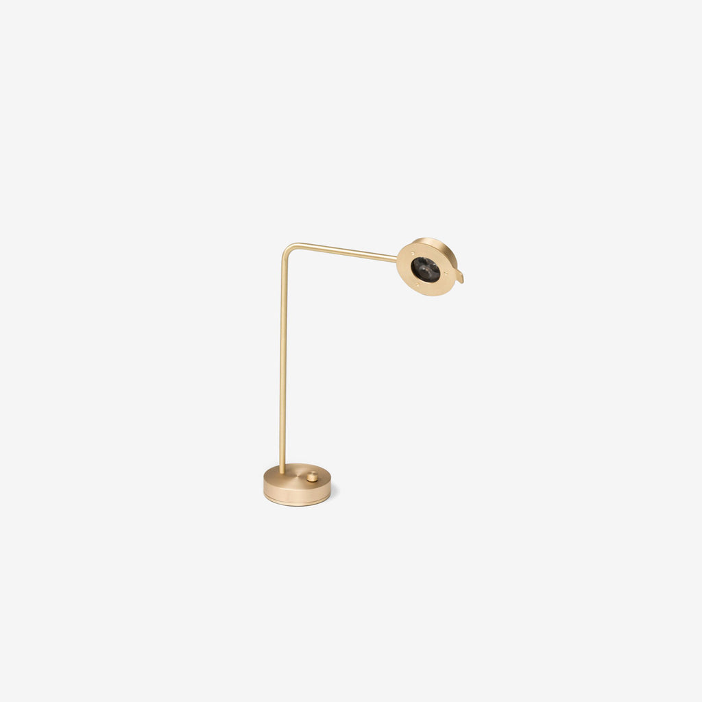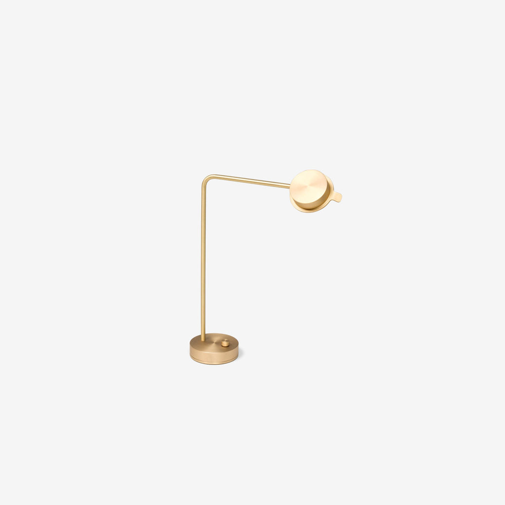 This lamp references an archetypal personal desk lamp for home or office use, and seeks to offer a fresh interpretation of the familiar on a domestic scale. The lamp is predominantly made from brass – a material commonly associated with lights, though not so widely used today. The intention was to create a simple form with a clear distinction between a base, a single arm and a lamp head. The lamp has no visible joints and minimal directional movement, without compromising its function.